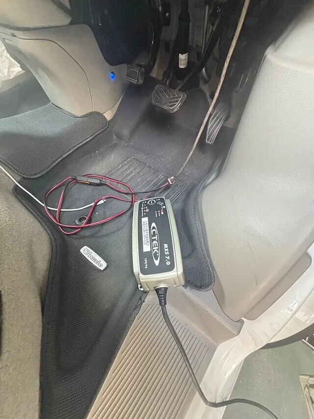 写真のように交換作業中も電源供給することで、ナビや時計などの設定がリセットされる心配もありません。お客様にご不便をおかけすることのないよう配慮しております。